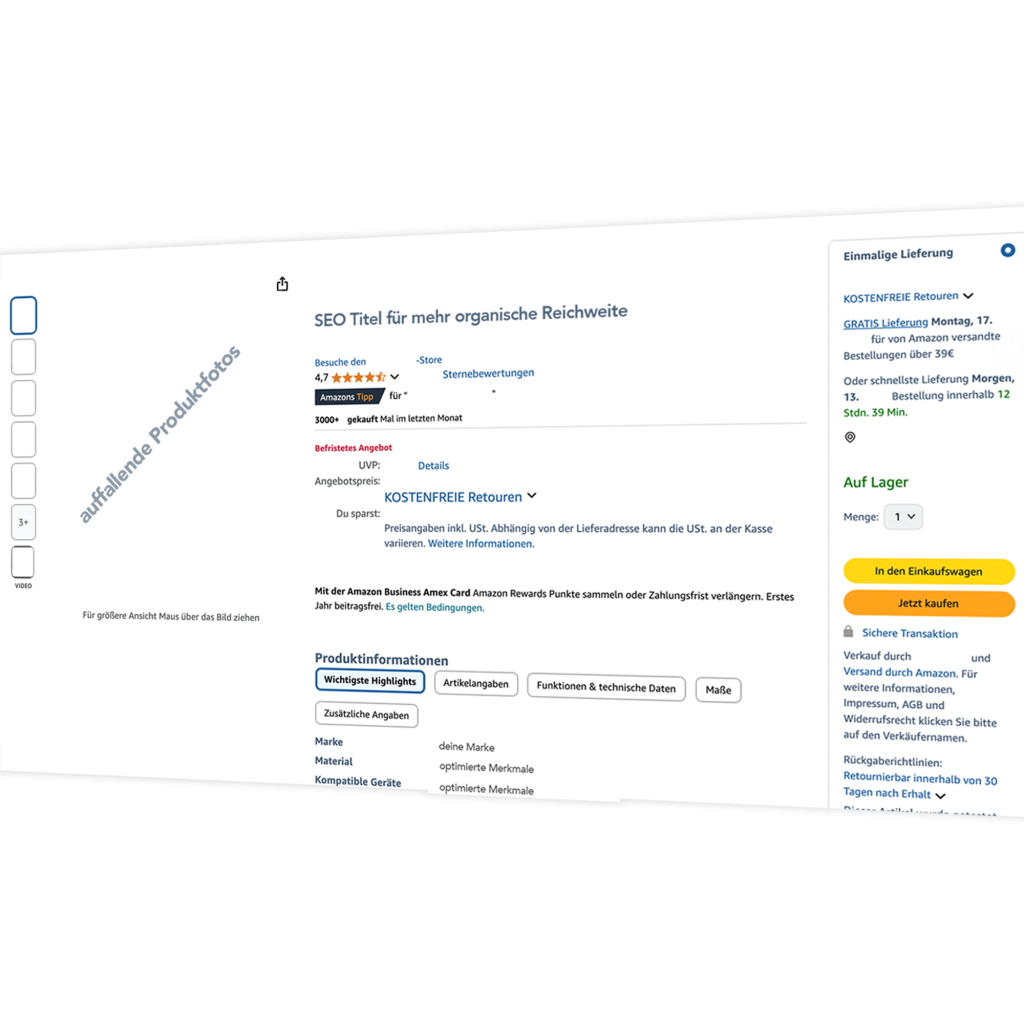 Wir helfen dir, dein Listing auf das nächste Level zu bringen – mit optimierten Texten, professionellen Bildern und auf Wunsch sogar mit A+ Content.